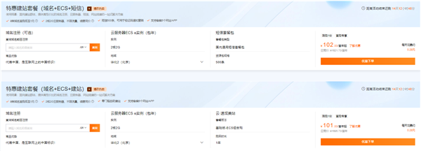 1、域名+云服务器+短信套餐包,1年费用仅需102元。