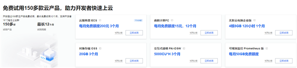 此外,本次活动还有免费试用 150 多款云产品等 ,包括函数计算 FC 180 元额度 3 个月 、云服务器 ECS 每月免费额度 200 元 3 个月、1 个月的 4 核 8GB 无影云电脑企业版等。